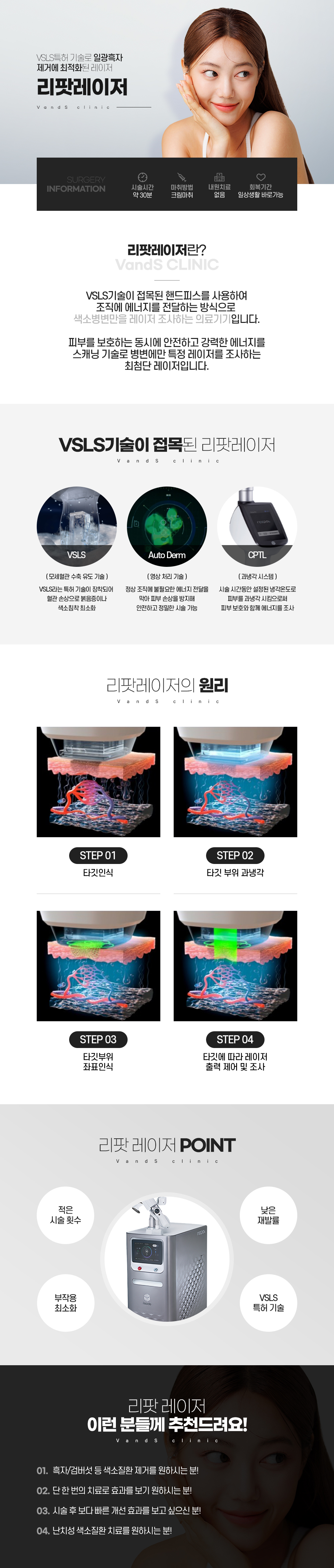 일정하지 않은 색소 분포에 대응해 레이저 강도를 자동으로 조절합니다. 하이퍼쿨링테크 핸드피스를 사용해 통증이 적습니다. 시술 후 바로 일상생활이 가능합니다. 콘택트 쿨링 방식의 CPTL 기술을 사용합니다. 쿨링 방식의 VSLS® 기술을 사용합니다